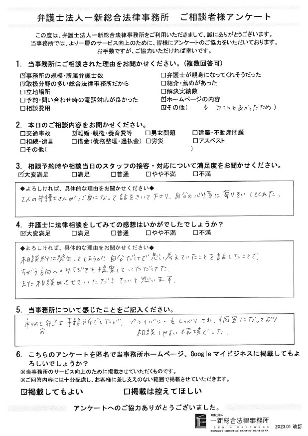 初めての弁護士事務所でしたが、プライバシーもしっかりされ、個室になっており、相談しやすい環境でした。